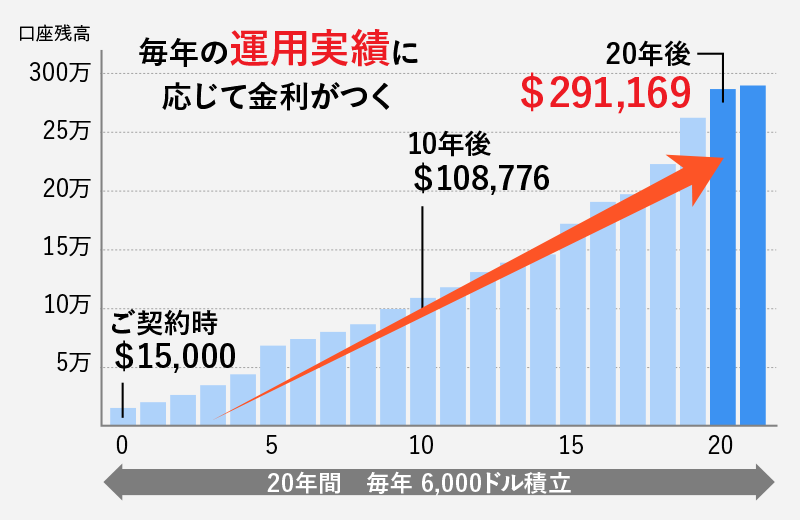 ※59歳半前にご解約または一部引き出しを行う場合には、ペナルティーとして、米IRSへ利益分の10%を納税する必要があります。年金受取について