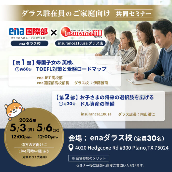 主人のアメリカでの転職を機に、日本の会社を通じ加入していた保険がなくなってしまったため、生命保険の金額が足りないのでは?と相談に来ました。 死亡時にソーシャルセキュリティーから家族にでるお金の話なども聞き、過不足なく加入が出来て安心しました。 また、気になっていたものの手付かずであった子供の学資積立にも相談に乗って頂き、下の子は十分間に合うとのことで短期で積み立てるプランに加入しました。良いところばかりでなくデメリットや税金面の話もしっかり話してもらい納得して一番いいプランを選べました。(ご夫婦・お子さまあり・40代の方)