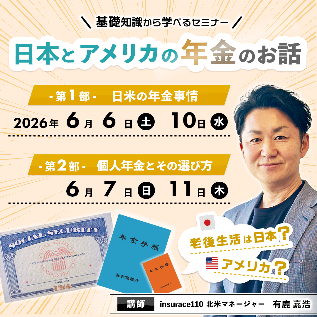 - 昨今のニュースから公的年金だけでは老後、子供に迷惑をかけることになるかも・・と不安に思っていました。日本語でのセミナーなので解りやすく、その上、日本とアメリカの比較や具体例を出していただいて、いろいろとイメージしやすく助かりました。駐在で在米中なのでいつか日本には帰国しますが、在米中にできるいろいろな貯蓄の選択肢なども聞けてよかったです。老後のことをしっかり考える良いきっかけになりました。(40代のご参加者の声)